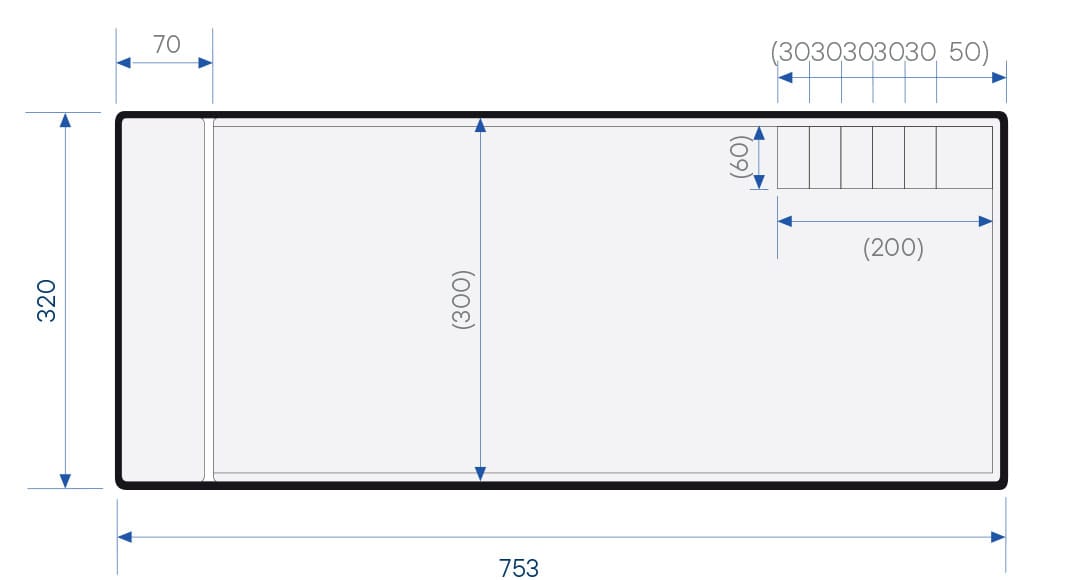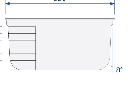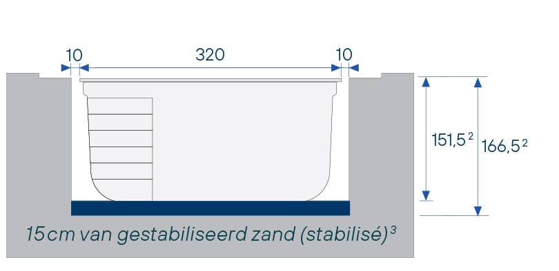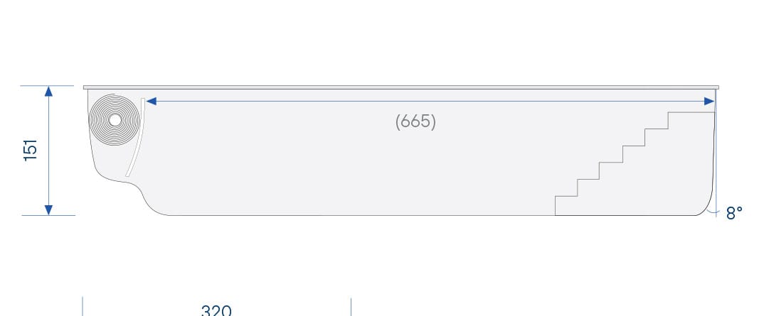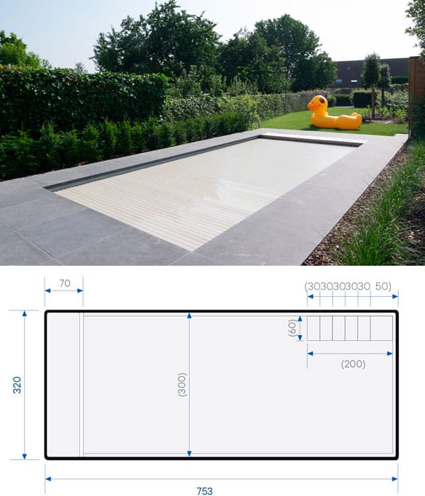 Een rechthoekig bad met een rechte trap bestaande uit 6 tredes, ideaal om veilig in het bad te geraken.
