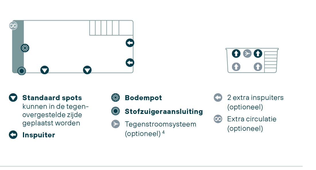 Het aandrijfsysteem is voorzien van dubbele geïntegreerde skimmers, wat zorgt voor een efficiënte en schone watercirculatie.