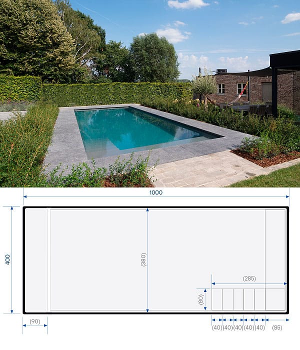 Een zwembad van 10 meter lang dat mooi combineert met eender welke omgeving.