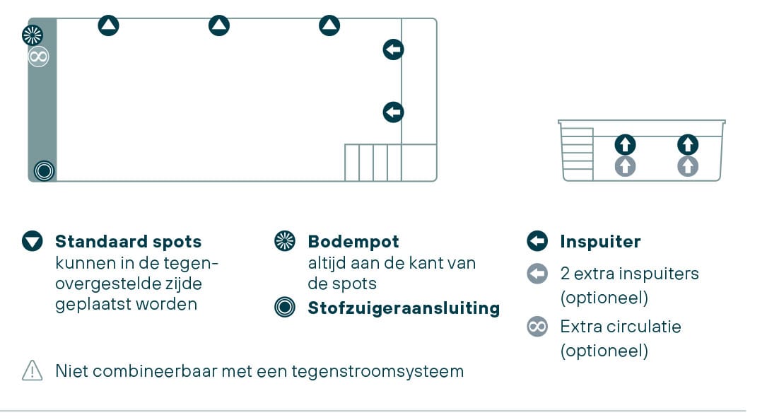 Rechthoekig zwembad voorzien van een onderwaterbank en een trap met 6 treden