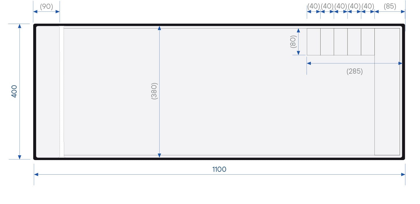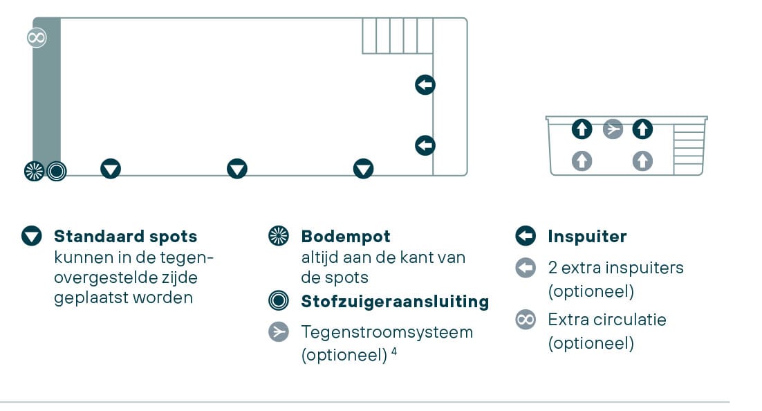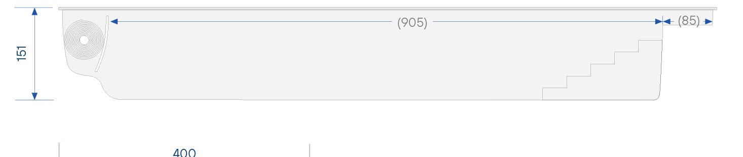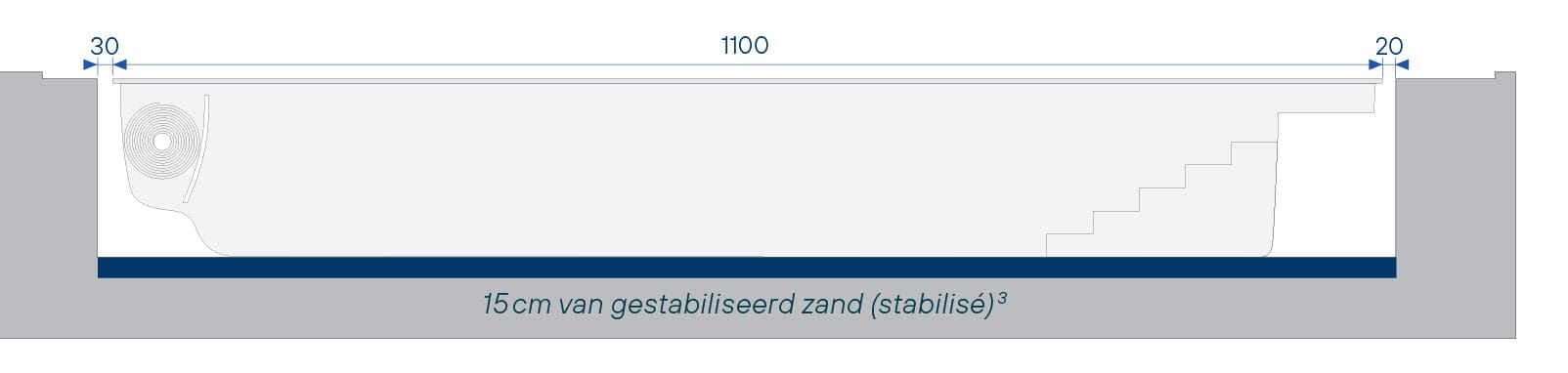 Dit kwalitatief hoogstaand monoblok zwembad heeft een comfortabele trap waarvan de eerste trede een onderwaterzitbank (‘plage’) vormt. De ideale plaats voor een eerste zwemervaring voor de allerkleinsten of om gewoon te baden.