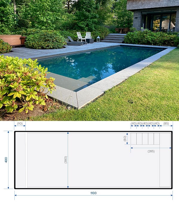 Rechthoekig zwembad met comfortabele trap met 6 treden, waarvan de eerste een ‘Plage’ vormt en de volledige breedte van het zwembad inneemt