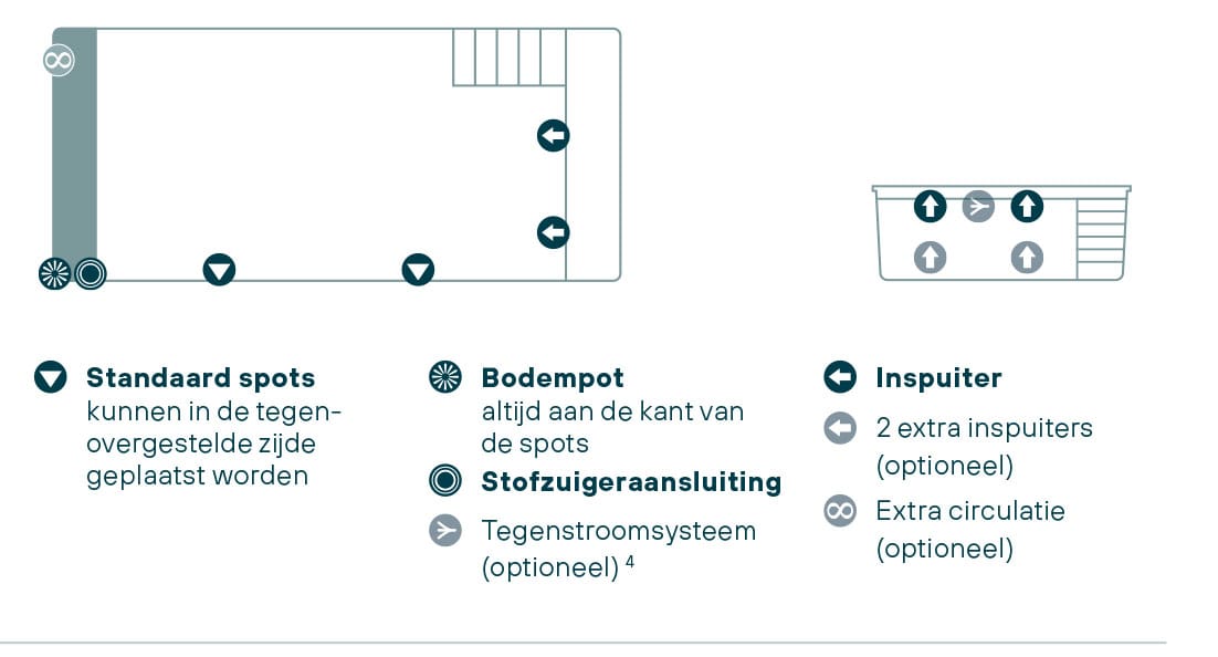 Rechthoekig zwembad voorzien van een onderwaterbank en een trap met 6 treden