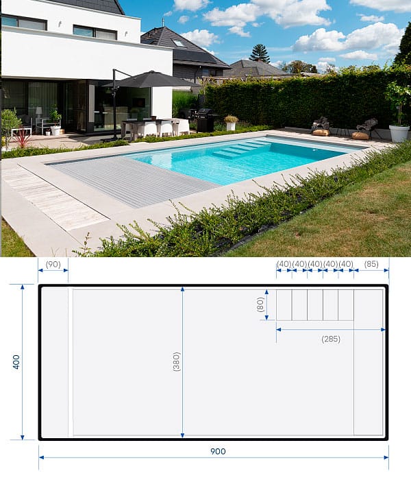 La Plage 9 is een rechthoekig zwembad dat sport en ontspanning combineert. Zoals de grote broers, de La Plage 10, La Plage 11 en La Plage 12, geniet dit zwembad van een uitzonderlijk ontwerp rond de trap waarbij de eerste trede tot een onderwaterzitbank is omgevormd. Op deze bank kun je heerlijk ontspannen en ook is het ideaal om de allerkleinsten aan het water te laten wennen.