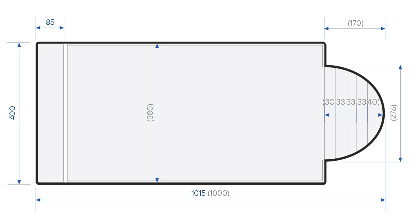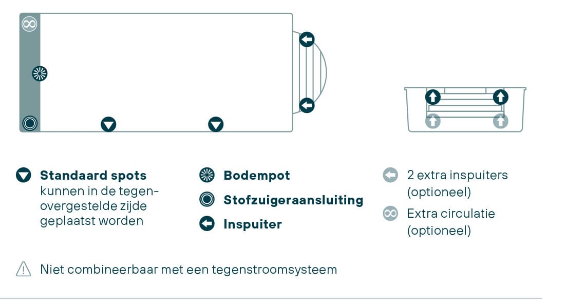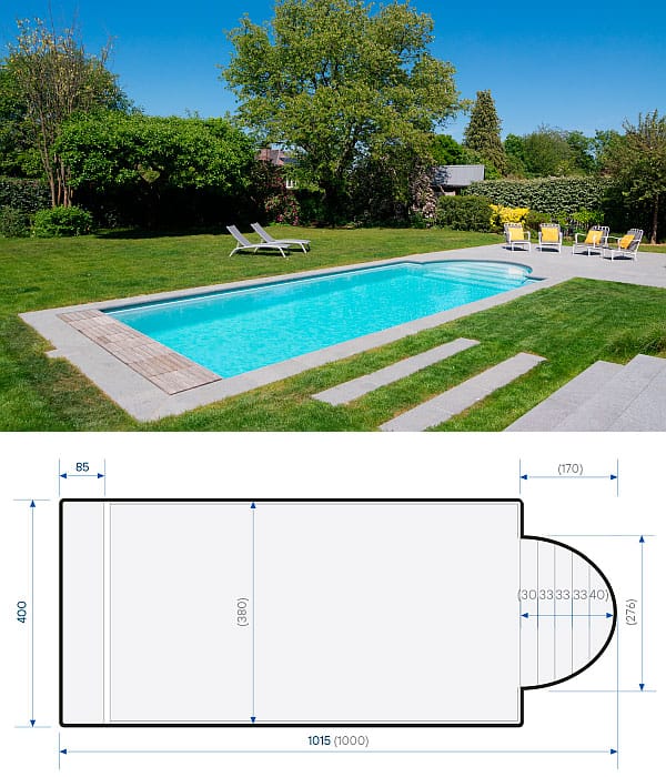 Een groots bad met zachte lijnen en een romeinse trap met 6 treden. Dit bad is uiterst geschikt voor spelende kinderen, een echt familiezwembad.